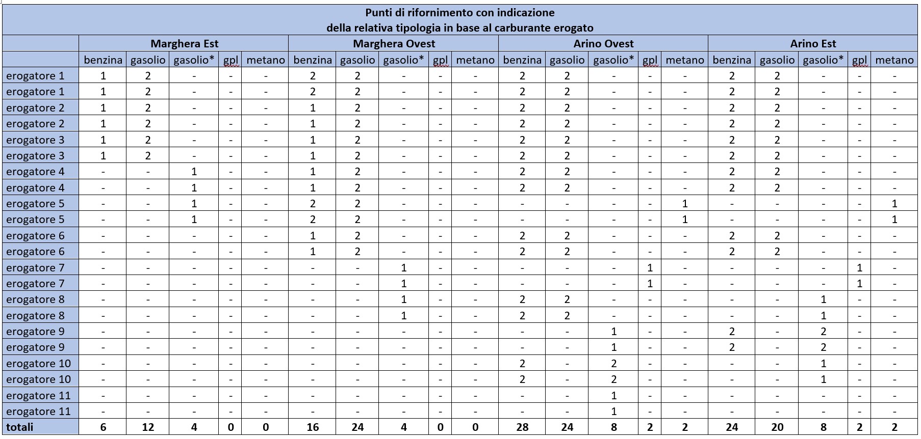 In questa tabella sono indicati i principali servizi offerti nelle aree di servizio.