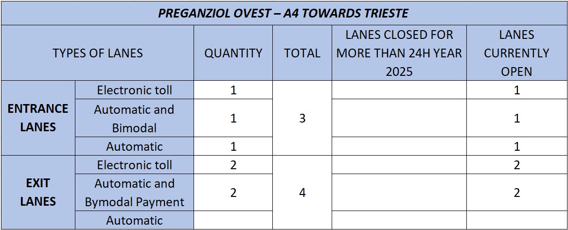 - A4: Preganziol (Preganziol Ovest at km 399+908 and Preganziol Est at km 400+361);