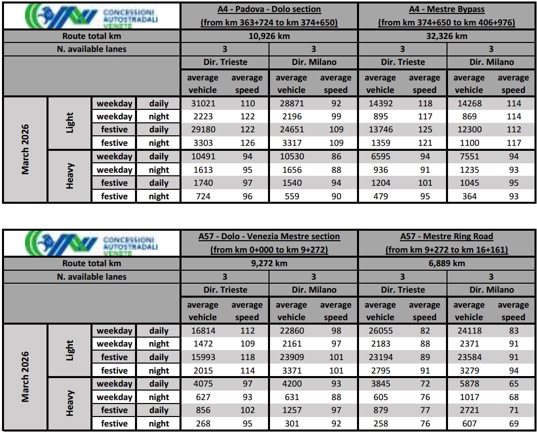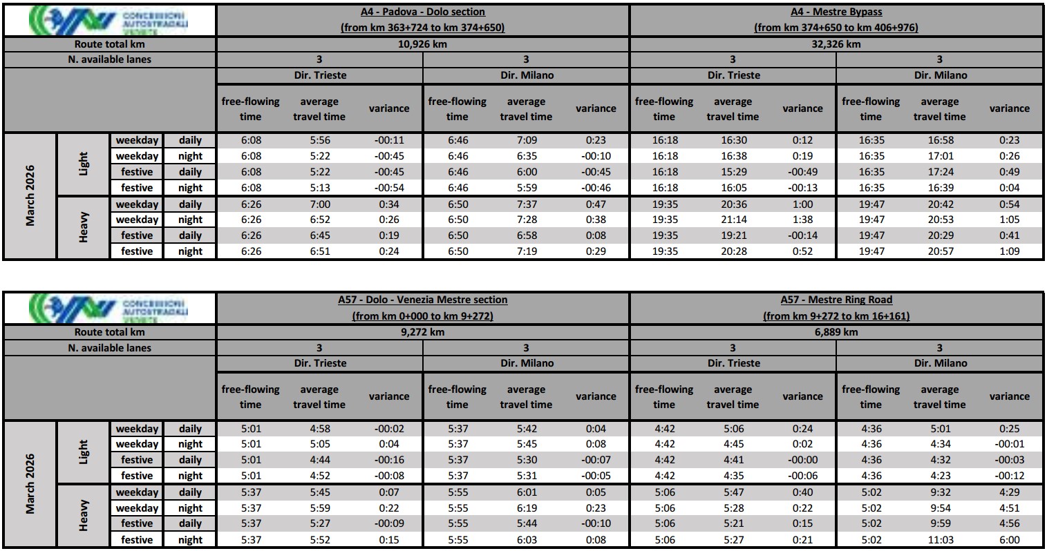 - "Free-flowing time" [min:sec]= time to travel the route at a medium speed 130 km/h for motorway sections and 90 km/h for the ring road section