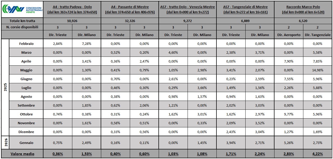 Impatto percentuale della presenza di cantieri calcolato come rapporto tra i chilometri di corsia che si rendono indisponibili e i chilometri di corsia disponibili al traffico in generale in assenza di cantieri, ponderati in termini temporali. Tale indice viene calcolato come media mensile degli ultimi 12 mesi per i cantieri di tipo fisso, inamovibili, effettuati in orario diurno (06 - 22).